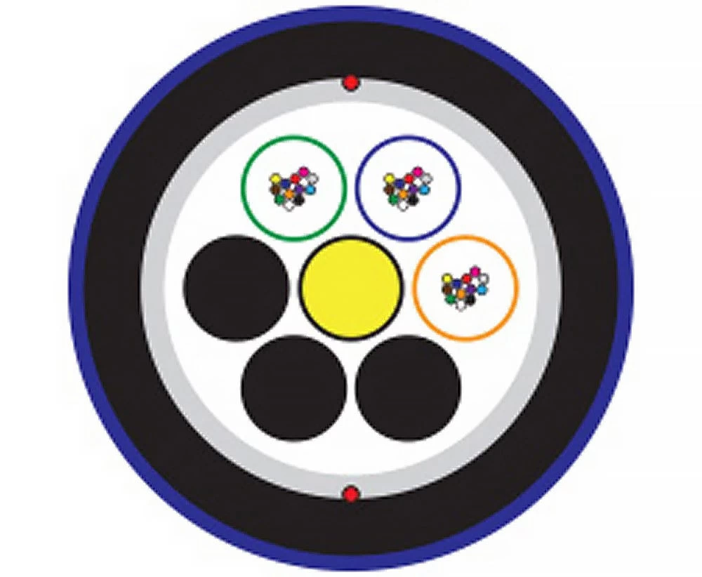 This standard loose tube construction features an inner UV resistant Polyethylene (PE) sheath and an outer termite/UV resistant Polyamide Nylon jacket.
