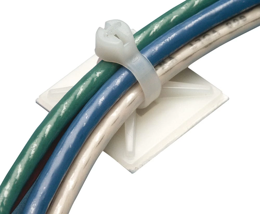 - Natural nylon cable tie mount with rubber-based self-adhesive base and two holes for additional screws